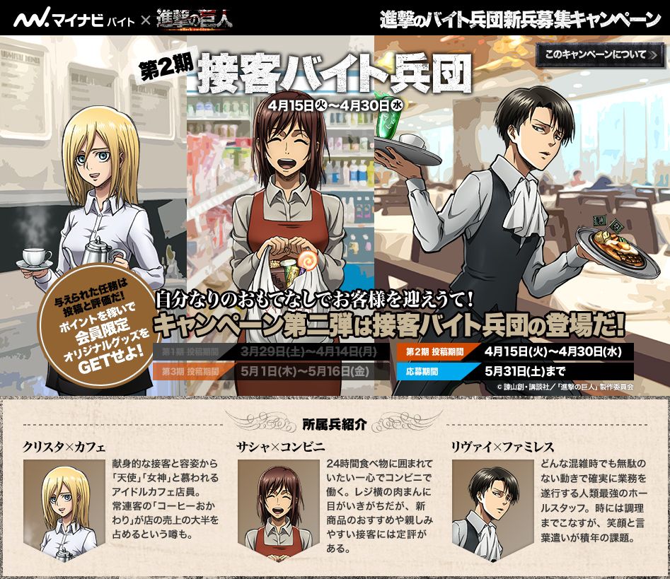 進撃の巨人 マイナビバイトコラボ第2弾でクリスタ カフェ サシャ コンビニ リヴァイ ファミレスのイラスト公開 萌えオタニュース速報 Linkis Com